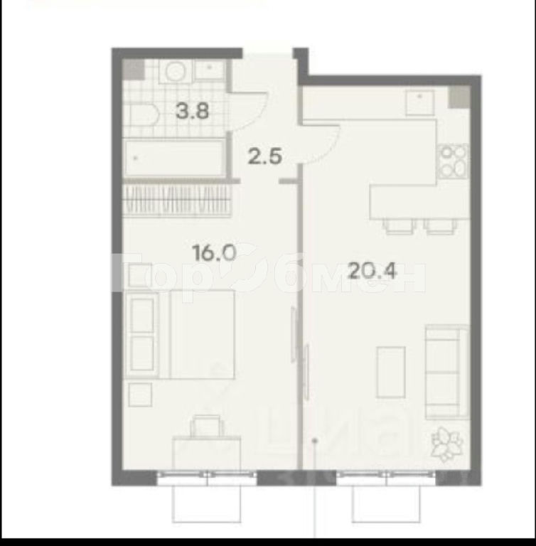 Удачная планировка: Просторная кухня-гостиная 20,4 м2 идеально для семьи и приема гостей. Общая площадь 43 м2.